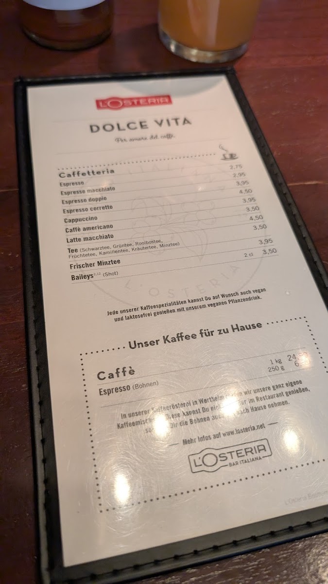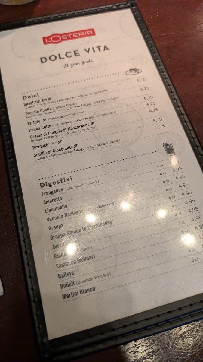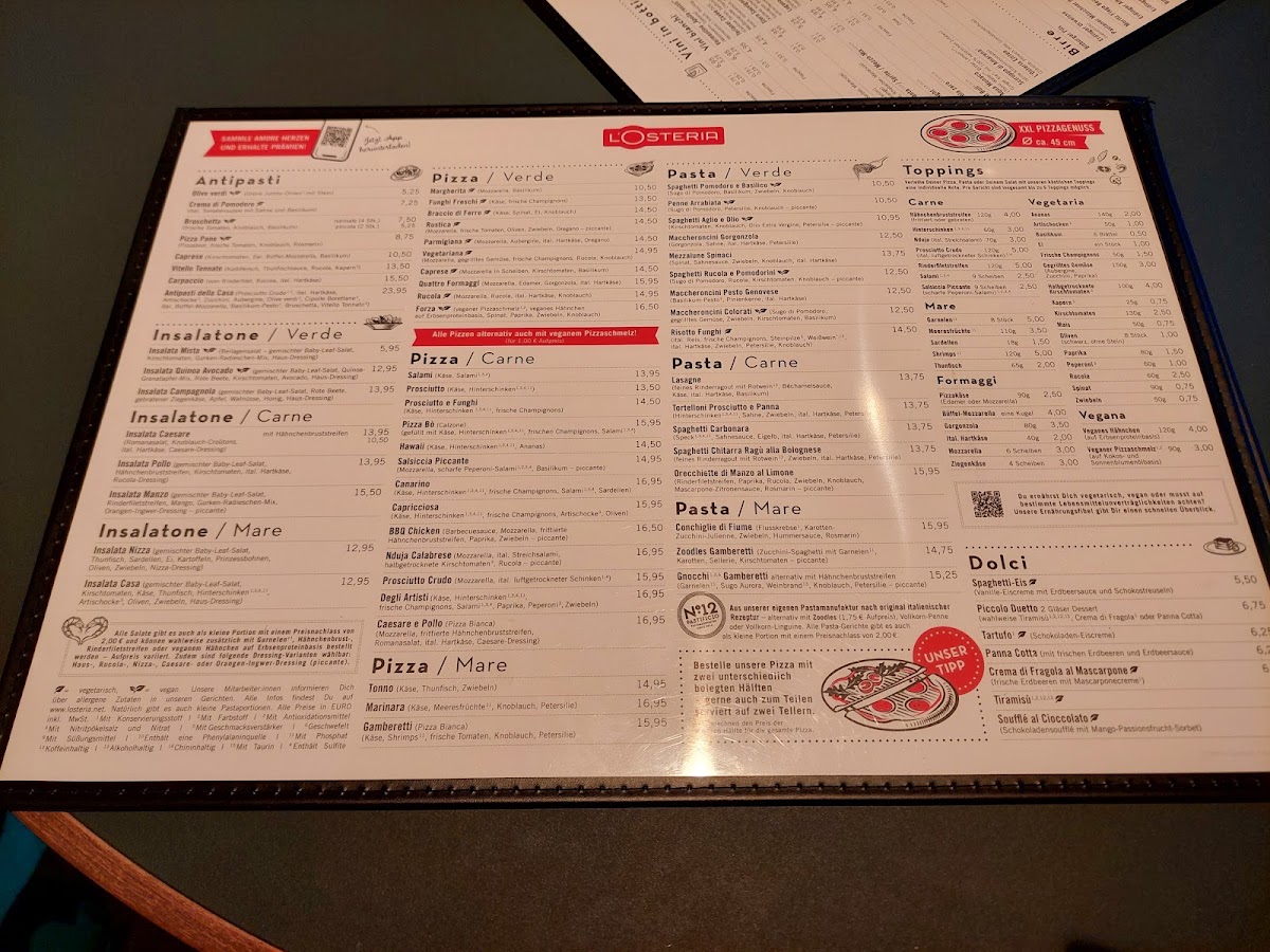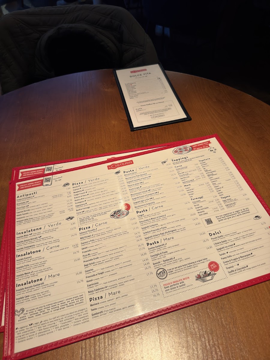 Beyond pizza, the offerings include varied Italian staples, with attentive service enhancing the experience. Pairing the meal with select Italian wines or the refreshing Hugo alkoholfrei aperitif elevates the culinary journey further. The warm, vibrant atmosphere complements the food, making L'Osteria a great spot for gatherings or cozy dinners. Overall, the menu’s breadth and quality capture the essence of Italy, leaving a lasting impression on guests.